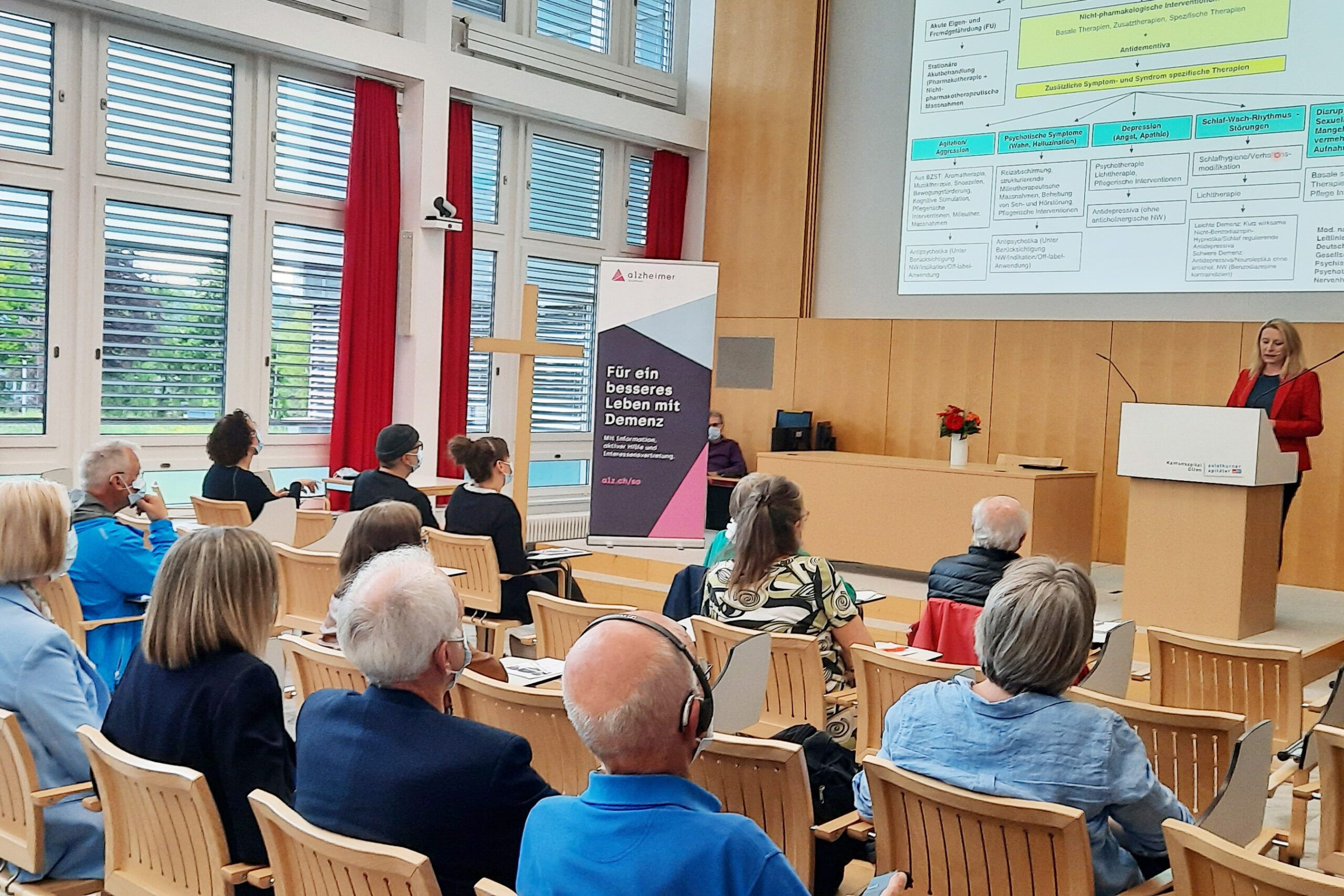 Vesna Stojanovic legte im zweiten Teil des Referates den Fokus auf die therapeutische Behandlung von Demenz. Diese sei wichtig aber ebenfalls sehr komplex. Ein besonderes Augenmerk gelte bereits bestehenden Erkrankungen, wie sie im hohen Lebensalter häufig vorkommen denn nicht jedes demenzspezifische Medikament sei für allen Patienten geeigent. Während der medikamentösen Behandlung sei deshalb eine engmaschige Betreuung mit regelmässigen Kontrolluntersuchungen massgebend. Manchmal müsse auch eine Behandlung eingestellt werden, wenn die Nebenwirkungen oder die Unverträglichkeit zu gross sind. „Glücklicherweise gibt es nebst der medikamentösen Therapie eine Vielzahl von nicht-medikamentöse Therapieformen und Massnahmen, mit denen das Wohlbefinden von Menschen mit Demenz gesteigert werden können“ so Stojanovic. Als Beispiele nannte sie die Verbesserung der Sensorik durch angepasste Lichtverhältnisse in der Wohnung und die richtige Einstellung von Hilfsmitteln wie Brillen und Hörgeräte oder Gedächtnistraining, welches durch gezielte Förderung der noch vorhandenen geistigen Fähigkeiten den Verlauf der Erkrankung erwiesenermassen positiv beeinflusst. Den richtigen Ansatz zu finden sei nicht immer einfach und es empfehle sich deshalb auch hier die enge Begleitung durch Fachspezialisten in Zusammenarbeit mit dem Hausarzt. Besonders wichtig sei für das Behandlungsteam der Kontakt mit den pflegenden Angehörigen, welche gleichermassen von der Krankheit betroffen sind, wie die Erkrankten selbst. Die Angehörigen seien durch die hohe Belastung bei der Betreuung ebenfalls auf Unterstützung angewiesen und werden deshalb idealerweise von Anfang an in die Behandlung miteinbezogen und an Organisationen und Institutionen vermittelt, welche Unterstützung und Entlastung anbieten, wie beispielsweise Alzheimer Solothurn, bei welcher Demenbetroffene Beratung und Begleitung erhalten. Stojanovic schloss das Referat mit einem hoffnungsvollen Ausblick auf die Entwicklung von neuen Alzheimermedikamenten. Trotz diverser abgebrochener Studien sei sie zuversichtlich, dass in nicht allzu ferner Zukunft wirksame Alzheimer-Medikamente die Zulassung in der Schweiz erhalten.