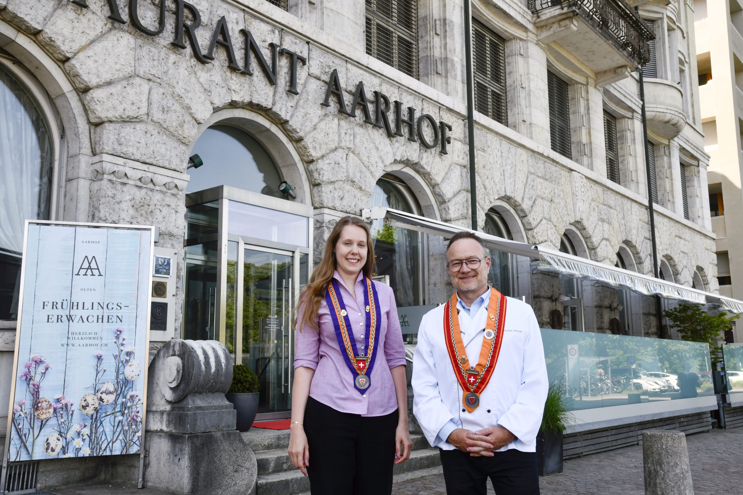Die Aufnahme des Restaurants in den erlauchten Kreis der «Confrérie de la Chaîne des Rôtisseurs» hatte bereits im Juni 2020 mit einem Dinner im «Aarhof» stattgefunden. Nun folgte am «Grand Chapitre nationale», der nationalen Versammlung, die persönliche Ehrung. Thomas Rhiner, seit 28 Jahren als Wirt im «Aarhof» tätig, erhielt als «Maître Rôtisseur» das rot-orange Band mit Kette und Plakette, Vanessa Blum das violette Band als «Chef de Table». Die 26-Jährige hatte vor zehn Jahren ihre Lehre im «Aarhof» begonnen und ist dem Haus, mit einem Jahr Unterbruch, treu geblieben.