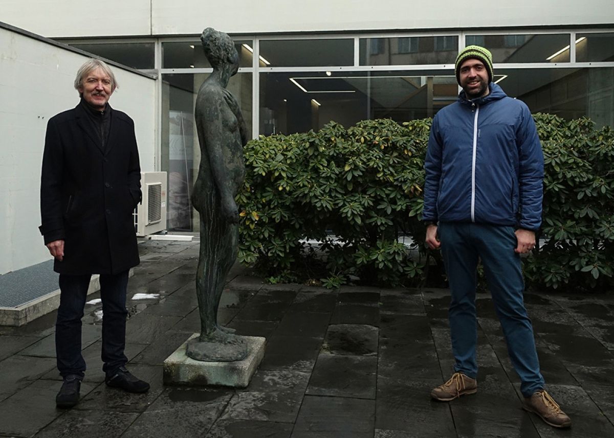 Der Online-Stadtrundgang startete für die knapp zwanzig Kunstinteressierten auf dem Bifangplatz, beim 1995 zum fünfzigsten Jubiläum der Mio gestalteten Brunnen. Die Umgebung des benachbarten BBZ ist gleich mit drei abstrakten Holz- und Eisenplastiken gestaltet. Für eine Bildungsinstitution ist das typisch – ist doch der Kanton eine wichtige Käuferin von Kunst im öffentlichen Raum. Der Spaziergang führte durch die Winkelunterführung, zu den drei Engeln an der Fassade der Alpiq. Anfangs Fünfzigerjahre von der damaligen Atel bestellt, gewähren sie Einblick in die Geschichte des Firmen-Mäzenatentums und den Fortschrittsglauben der Nachkriegsjahre. Etwas jünger, aber zum Zeitpunkt seiner Einweihung sehr umstritten ist das populäre Reiterdenkmal am Kopf der Bahnhofbrücke. Von dessen Sockel aus ist die markante blau-grüne Gewässerschutzplastik beim Ländiweg zu sehen. Im Geist der späten Sechzigerjahre aus Polyester geformt, stellt die Plastik heute die Denkmalpflege vor Probleme: sie ist über die Jahrzehnte spröde geworden. Überhaupt sei der Unterhalt von Kunst im öffentlichen Raum alles andere als einfach und werde vielerorts aus Kostengründen vernachlässigt, so Christof Schelbert. Als jüngstes städtisches Denkmal besichtigte die Gruppe das Abbild des «Königs von Olten» aus dem Jahr 2018 auf dem Kaplaneiplatz. Den Steinelefanten auf dem Platz der Begegnung zeigte Schelbert später als Beispiel eines Kunstwerks, von dem heute nicht mehr ganz klar ist, wie es zu seinem heutigen Standort kam. Als Objekt, das umgekehrt nicht an seiner ursprünglichen Stelle steht, zeigte er den mächtigen abstrakten Eisenstorch, der einst vom Platz der Begegnung in den Stadtpark verlegt wurde. Auch Wandmalereien wurden gewürdigt, so etwa das Wandbild im Ratsaal mit seinen subtil nuancierten Farbtönen und dem surrealistischen Bildnis von St. Martin im angrenzenden Pausenraum. Die Führung endete im angrenzenden Innenhof des Stadthauses, wo drei sich auf spannende Weise ergänzende Werke aus verschiedenen Epochen ausgestellt sind.