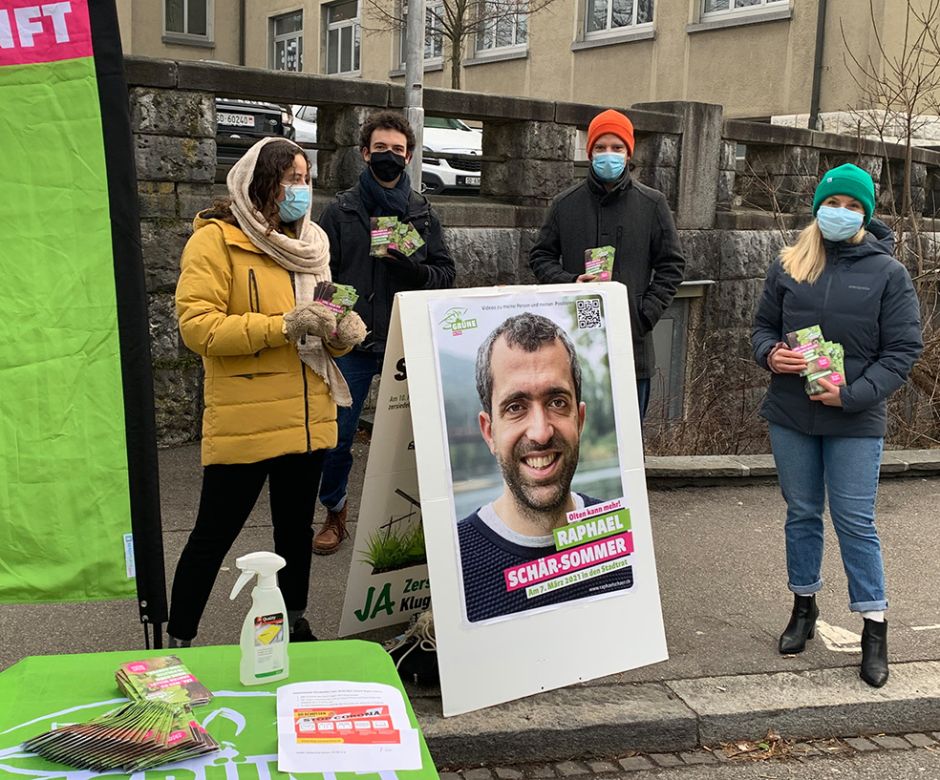 Sie verteilten auch diesmal Tütchen mit Pflücksalatsamen, die sich in die nunmehr aufgetaute Erde stecken lassen. Mit einem Durchschnittsalter unter 25 Jahren repräsentierten die Kandidierenden an diesem Samstag nicht nur die Jungen Grünen (als deren Vertreter der 19-jährige Klimaaktivist Lukas Lütolf an der Aktion teilnahm), sondern mit Marlene Fischer und Ivo Colombo auch eine neue Generation innerhalb der Mutterpartei. Mit der Walterswilerin Melissa Müller war ausserdem eine Vertreterin der neu gegründeten Grünen Niederamt Land mit von der Partie. Die Grünen machten aber nicht nur Werbung für sich selbst, sondern auch für Raphael Schär-Sommer, der sich um den Stadtratssitz der abtretenden Iris Schelbert-Widmer bewirbt, und für Regierungsrätin Brigit Wyss, die am 7. März ihren Sitz zu verteidigen hat. Wie immer kamen zahlreiche interessante Gespräche mit den Marktgängerinnen und Marktgängern zustande, wenn auch pandemiebedingt mit etwas mehr Abstand als sonst.